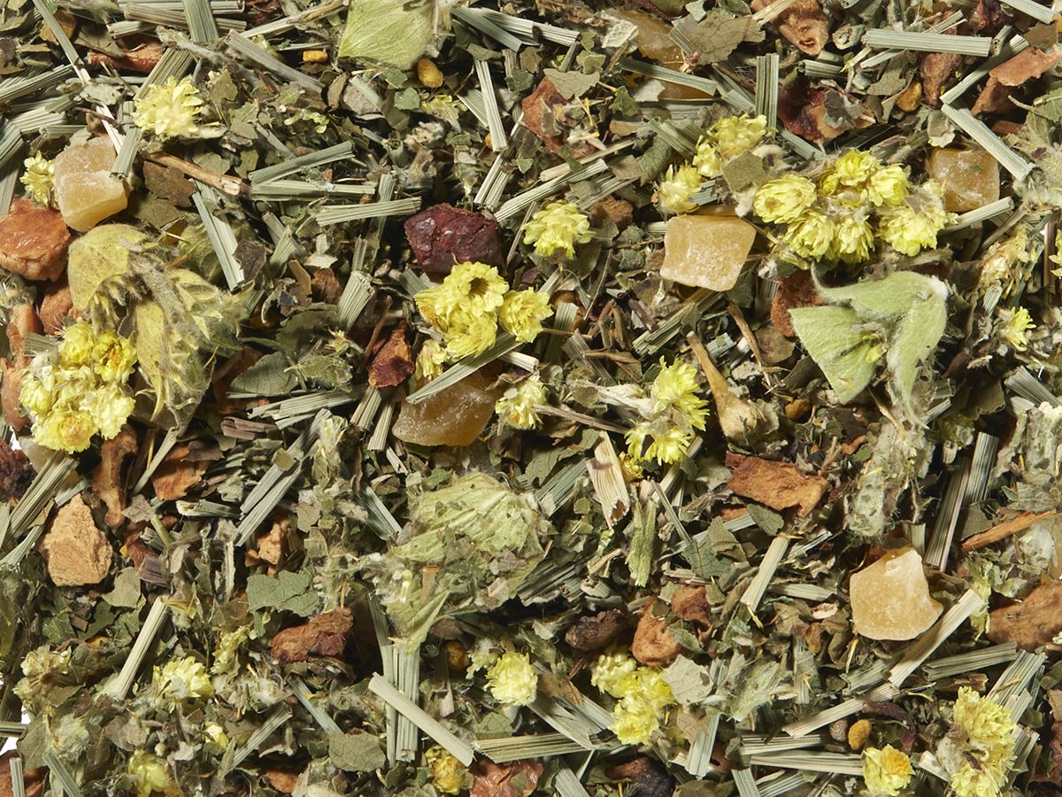 Innhold: eplebiter, mangoterninger (mango, sukker, syrningsmiddel: sitronsyre), sitrongress, bjørnebærblader, søte bjørnebærblader, smakstilsetning, pollen, kattefot, gresk fjellte.