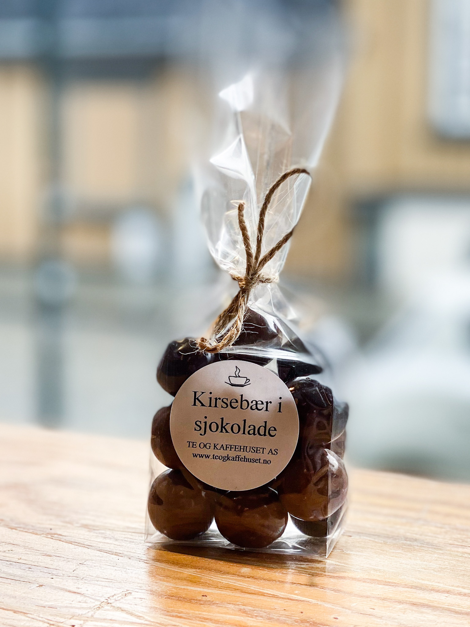 Kirsebær trukket i melkesjokolade og mørk sjokolade. En forfriskende sjokolade.