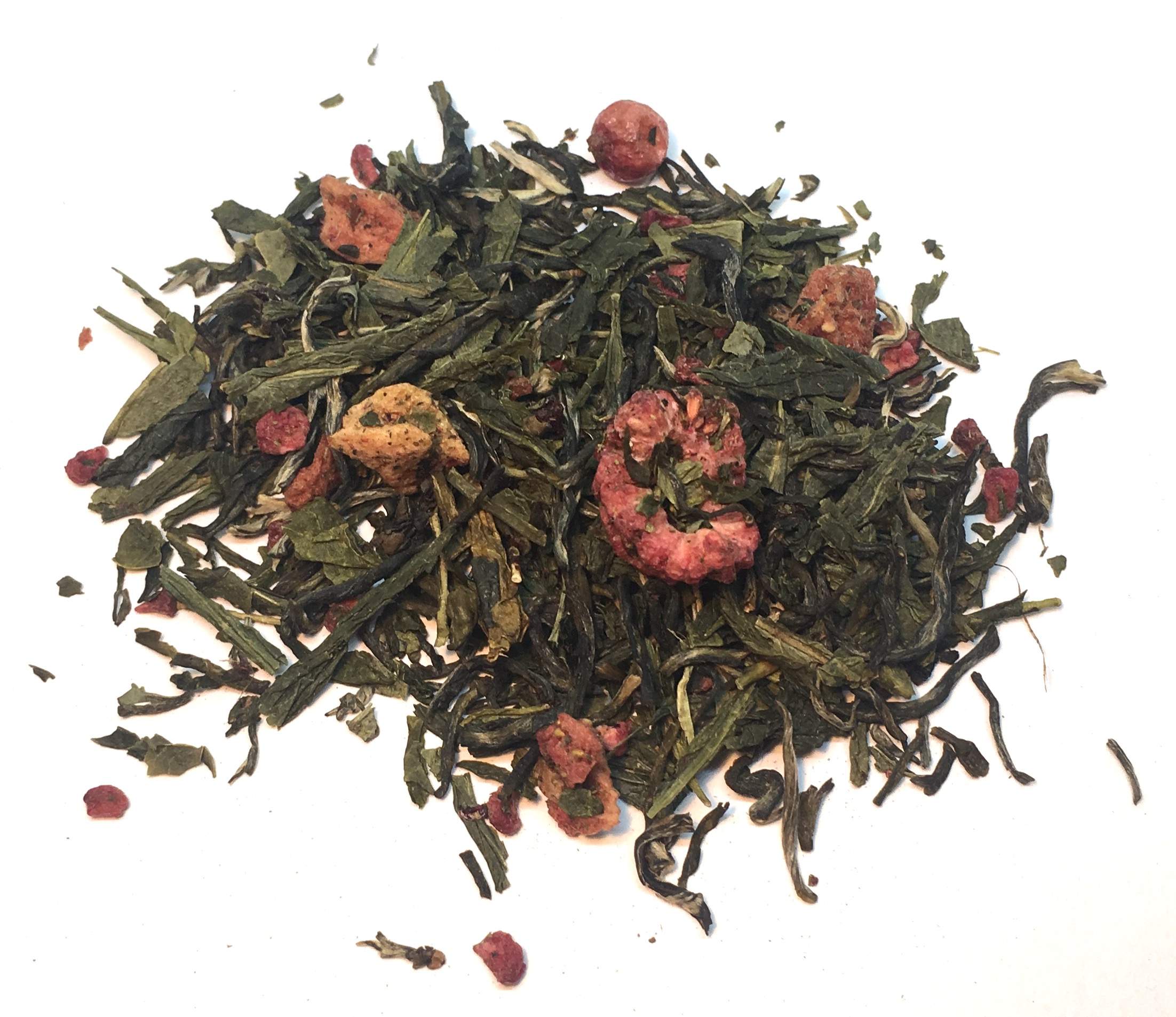 Inneholder grønn te (70%), hvit Yunnan (20%), aroma, jordbær, solbær, bringebærbiter, kirsebær og hele bringebær.
