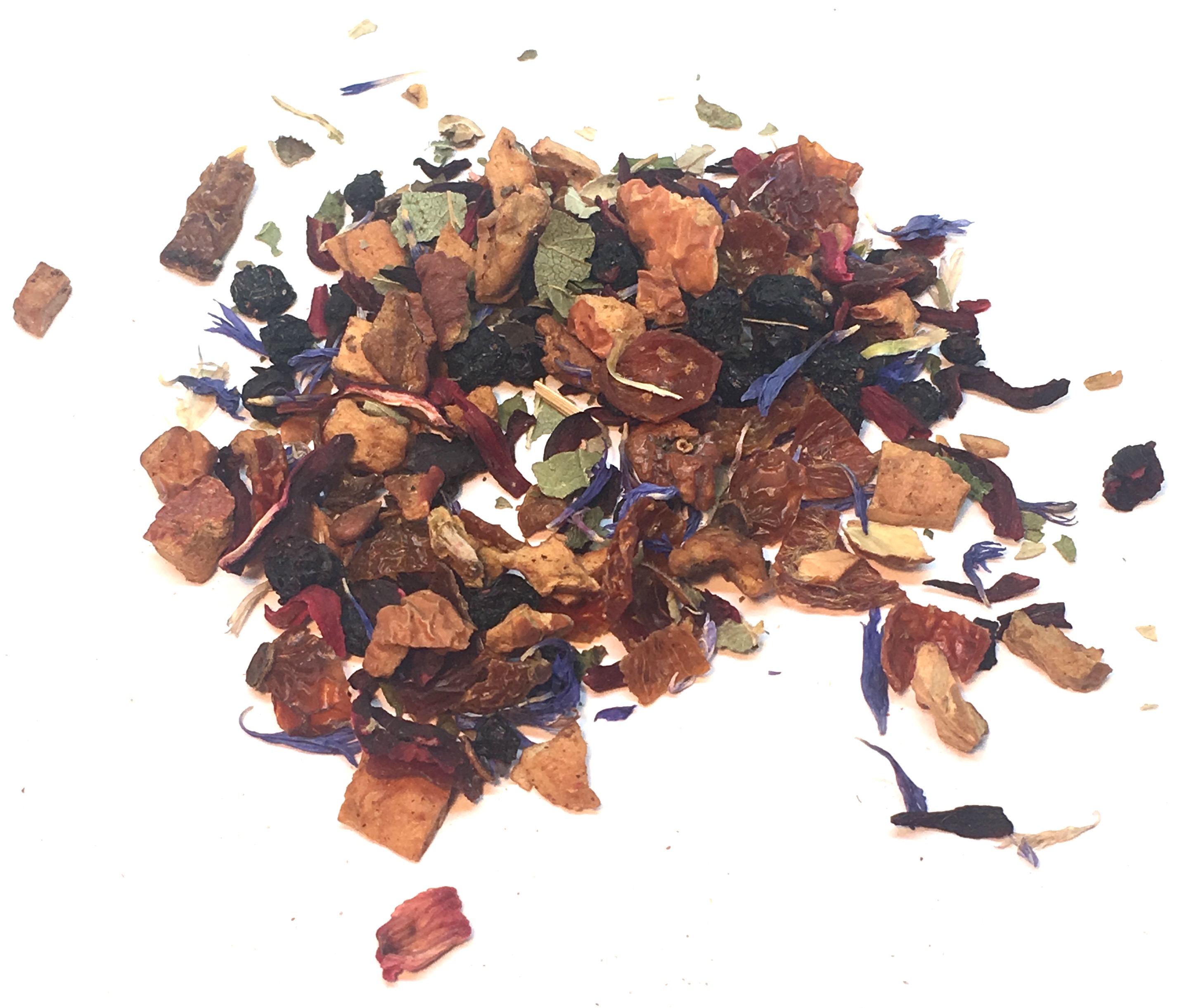 Inneholder eplebiter, blåbær, nypeskall, hibiskus, bjørnebærblader, solbærblader, aroma, kornblomstkronblader.