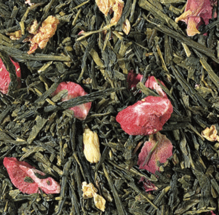 Sencha Jordbær Litchi er en nydelig rund grønn te med smaker av litchi, blomster og bær.