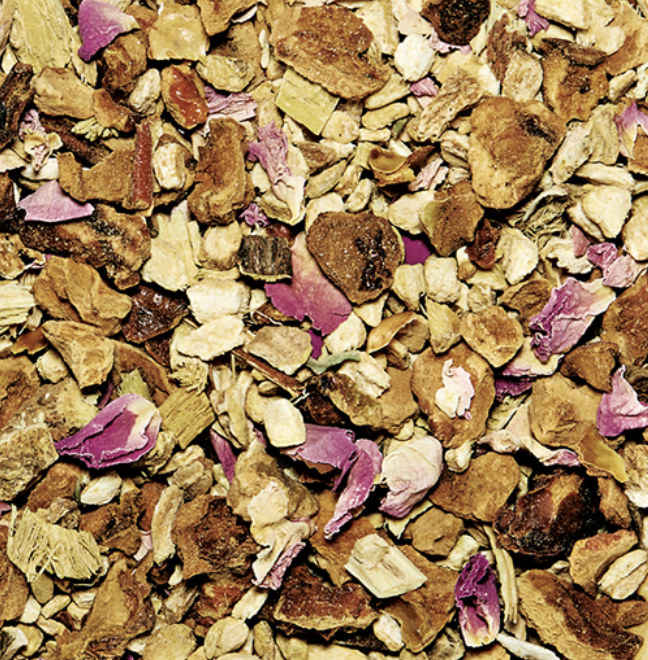 Inneholder ingefær (50%), eplebiter, sitronskall, lakrisrot og roseblad. Alle ingredienser er økologisk dyrket.