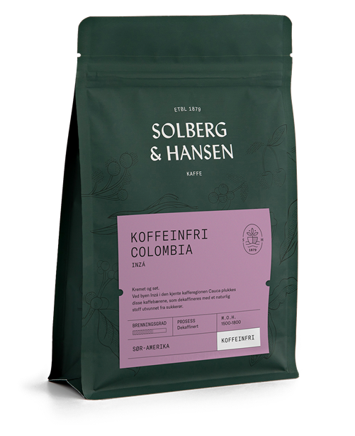 Ved byen Inzá i den kjente kafferegionen Cauca plukkes disse kaffebærene, som dekaffineres med et naturlig stoff utvunnet fra sukkerør.