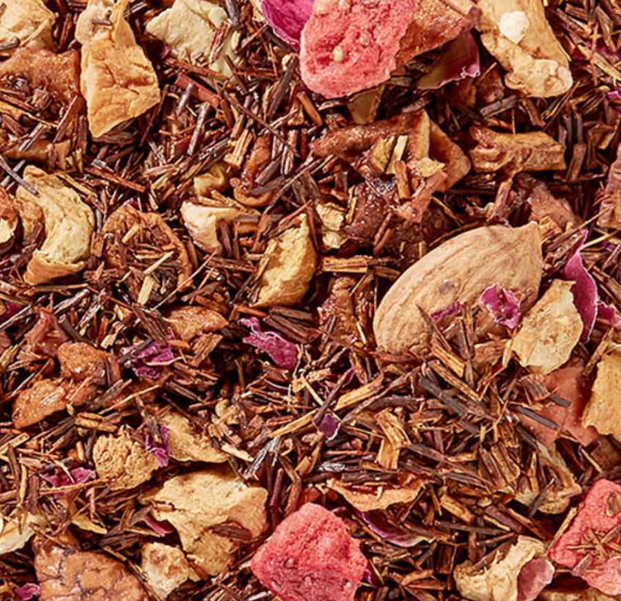 Inneholder rooibos, eplebiter, sure eplebiter (eplebiter, sitronsyre), aroma, aprikoskjerner, roseblad og jordbær. mandeler