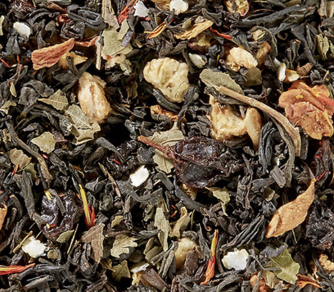 Inneholder svart te (58%), eple, rips, aroma (selleriolje), søte bjørnebærblad, quinoa, plomme og safrantistel.
