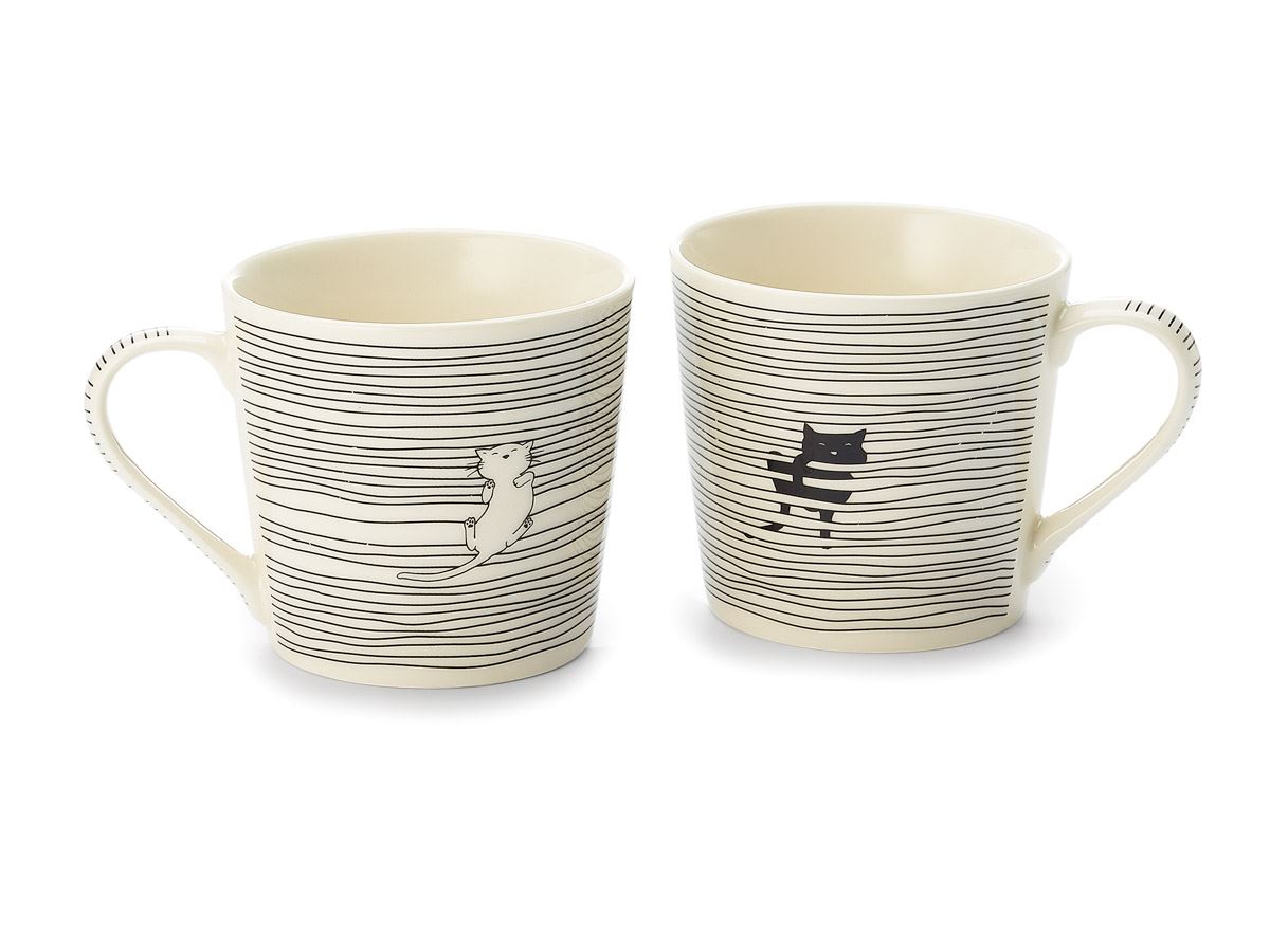 Svart og hvit kopp med hvit katt. Koppen tåler både oppvaskmaskin og mikrobølgeovn. Lagd av benporselen.