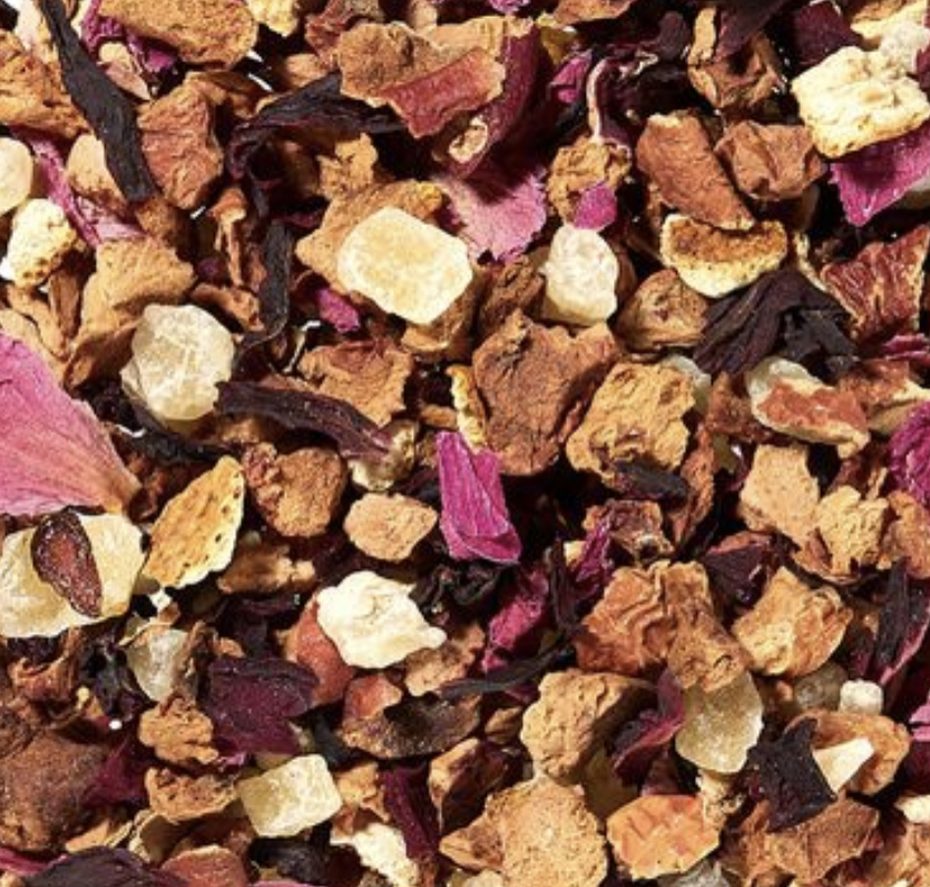 Inneholder eple, ananas (ananas, sukker), hibiskus, appelsinskall, rødbeter, aroma, sitronskall, granateple og peon.