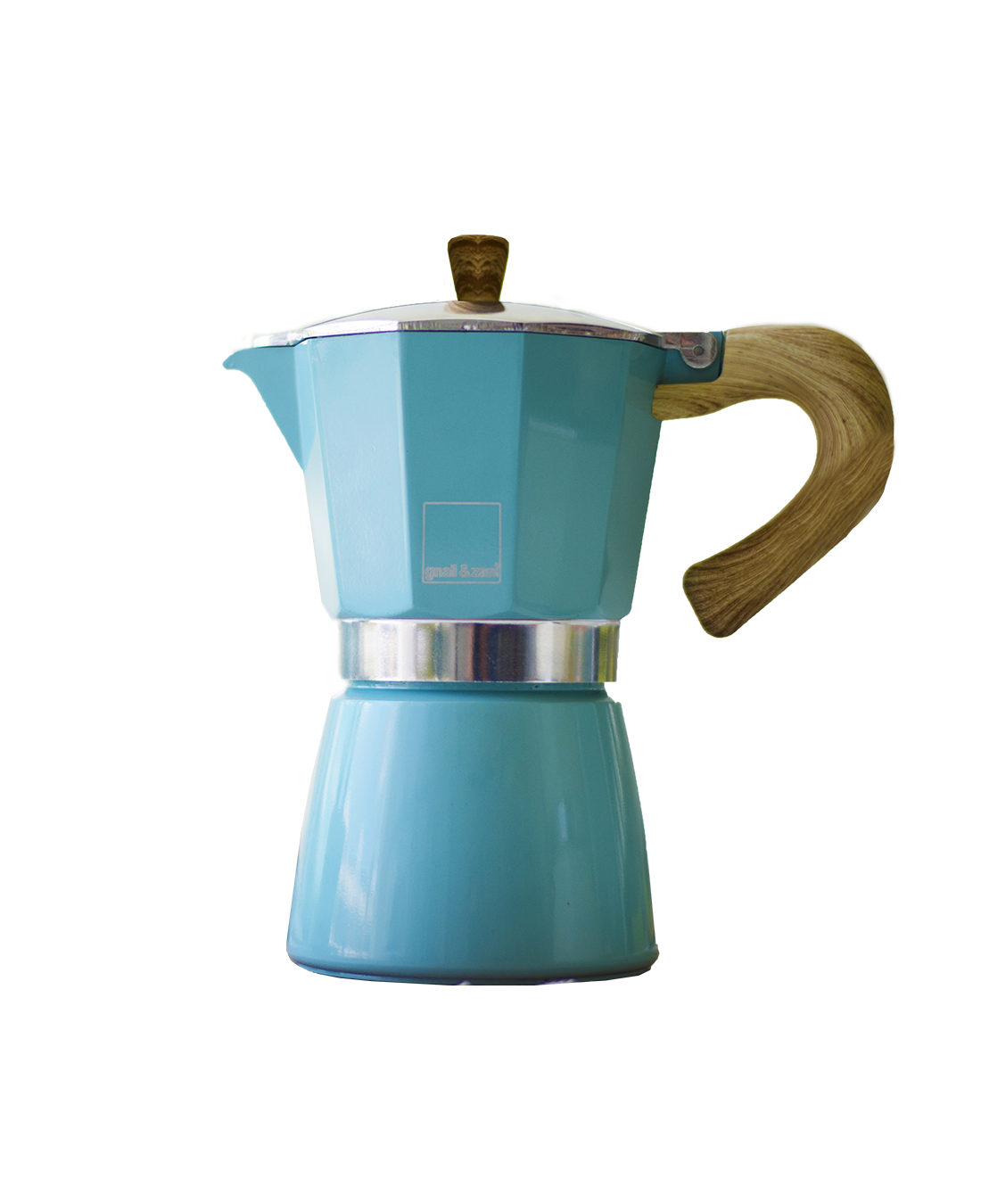 Denne er en 3-koppskanne med en lys blå farge, som rommer 130 ml kaffe.