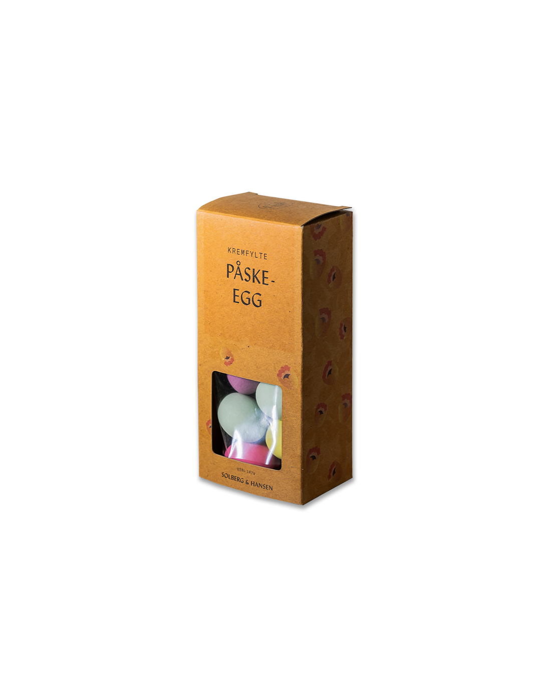 Myk melkekrem med små hasselnøttbiter, trukket i melkesjokolade med et knasende ytre i delikate farger.