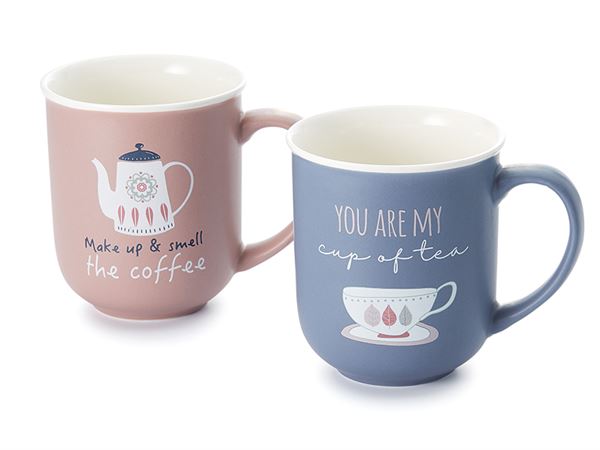 Tekopp i dus, matt rosa, med teksten "make up and smell the coffee".