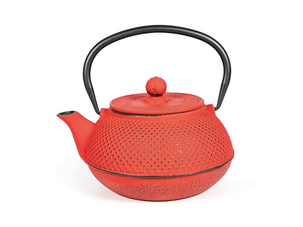 Nydelig rød jernkanne i støpejern. Kannen tar 0.8 liter og kommer med en tesil i rustfritt stål. For å unngå rust er den emaljert på innsiden.