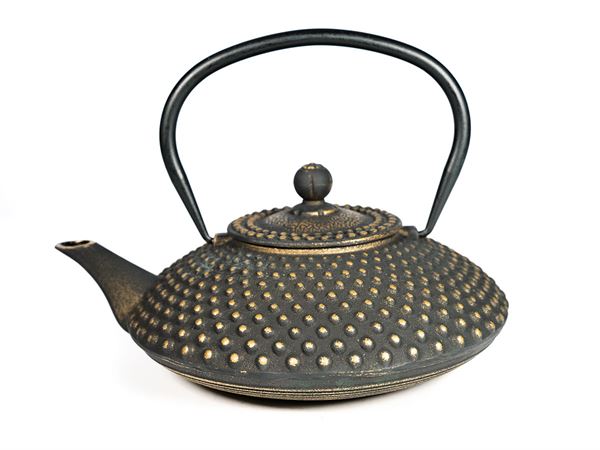 Svart jernkanne med gulldetaljer i støpejern. Kannen tar 1,2 liter og kommer med en tesil i rustfritt stål. For å unngå rust er den emaljert på innsiden.