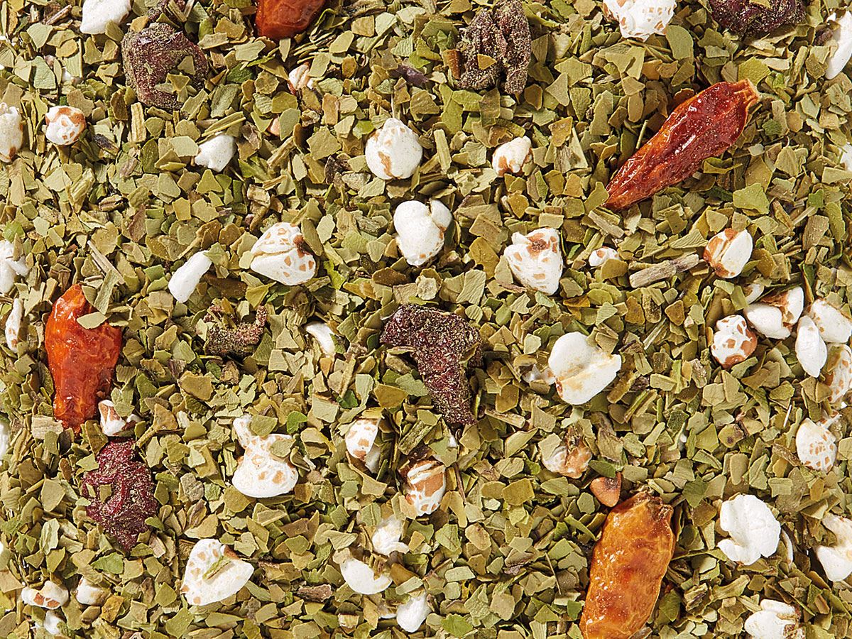 Ingredienser: Brazilian Mate, poppet bokhvete, chili, frysetørkede sure kirsebærbiter, sitronolje, naturlig kryddermandelsmak, fra økologisk dyrking.