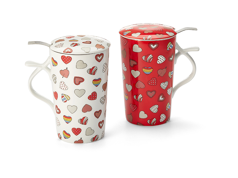 Tekopp med tesil og lokk som også kan brukers som fat til tesilen. rød kopp med hjerte mønster.