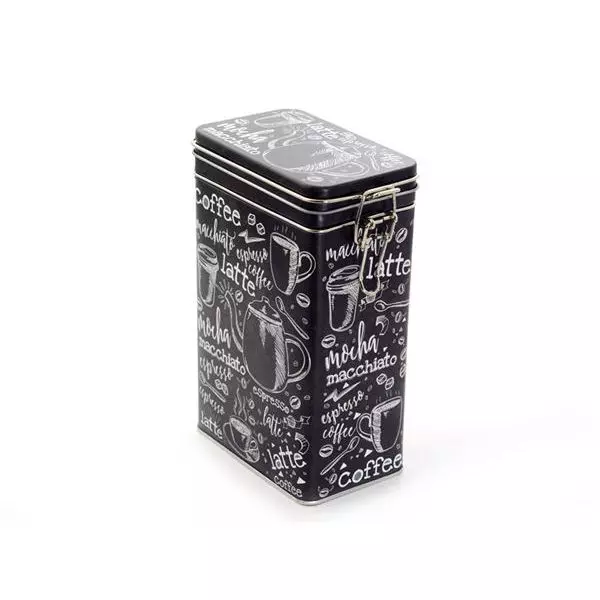 Svart boks med mønster i metall for bedre oppbevaring av te eller kaffe. Boksen rommer ca 500 gram. Silikonring i toppen som gjør den ekstra tett.